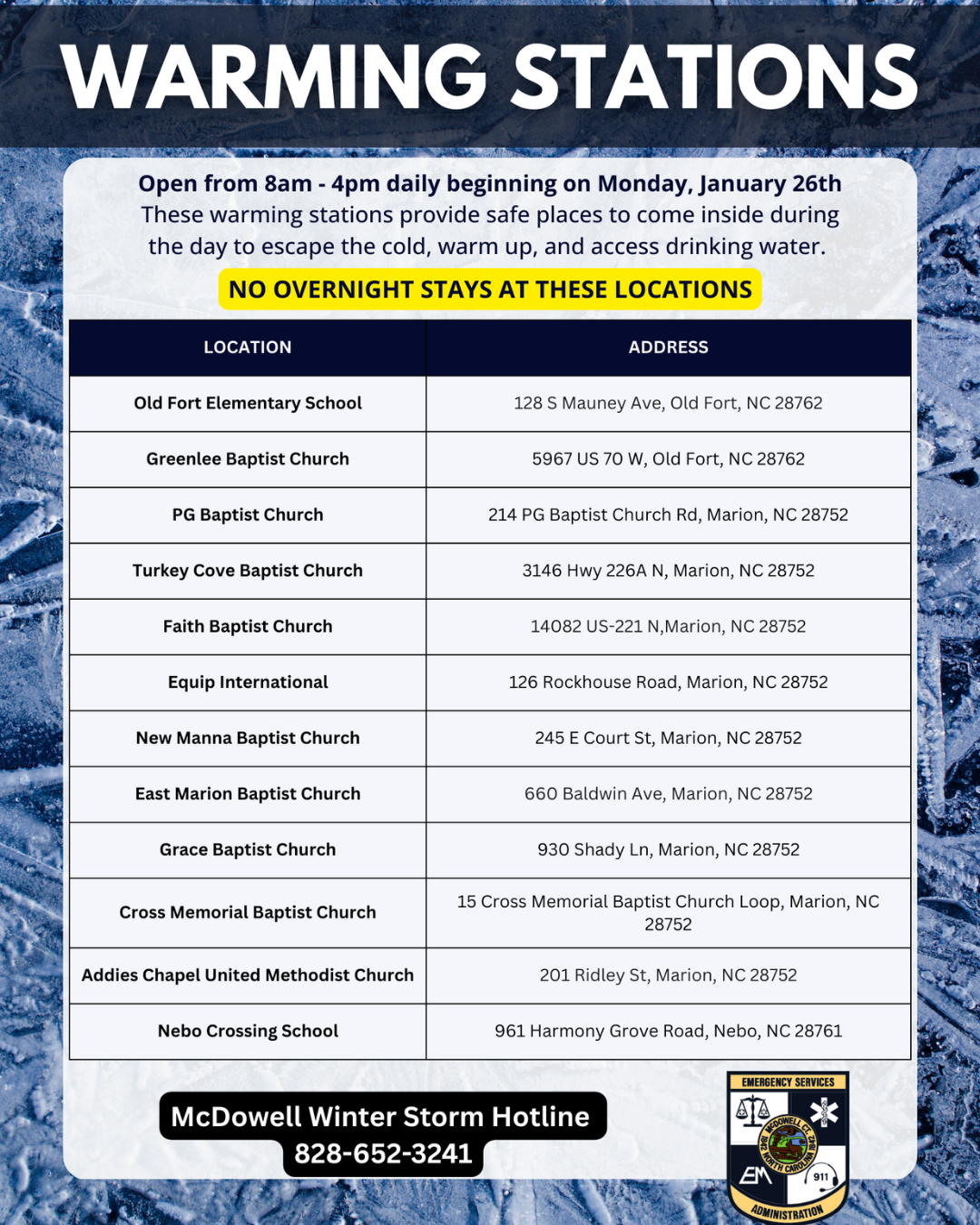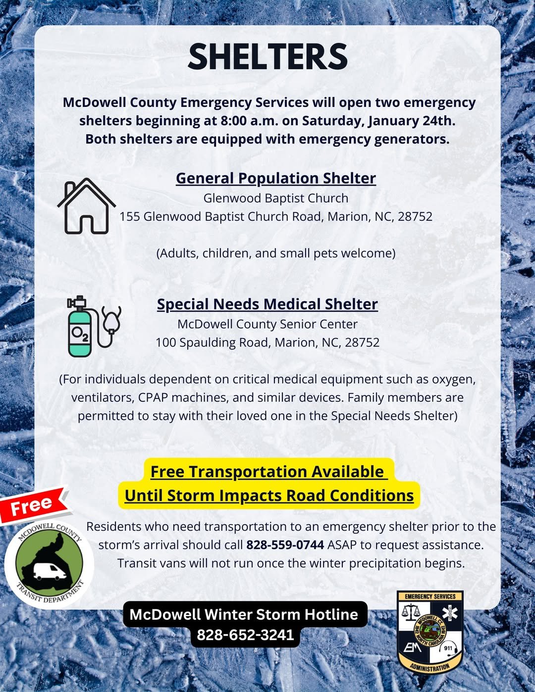 With the snow and ice approaching, we want to be as prepared as possible. McDowell County has a strong history of coming together to care for one another during storms—as we saw during Helene. With that in mind, if you are able to volunteer in any of the capacities listed, please take a moment to fill out the form below. We truly appreciate you, and you play an important role in caring for our community.